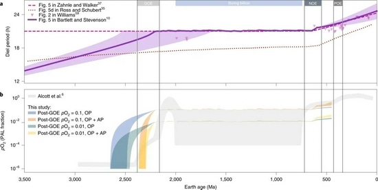 克拉特惊讶地发现,地球自转速度与氧气含量的变化是同步的。地球自转减速中断了10亿年,这10亿年间大气中的氧气水平也保持不变。而后地球自转再次开始减速时,发生了第二次大规模氧化事件:新元古代氧化事件(Neoproterozoic OxygenaXQtion Event)。克拉特对这两者之间可能存在的联系很感兴趣。