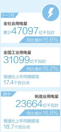1—7月,全社会用电量累计47097亿千瓦时,同比增长15.6%。中国电力企业联合会发布的数据显示,1—7月,东、中、西部和东北地区全社会用电量增速分别为16.7%、17.2%、14.0%和9.4%。