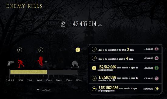 敌人总击杀数1亿4243万7914个,3天内击杀的敌人等于英国总人口(6400万),4天内击杀数量达到了日本总人口(1.26亿)