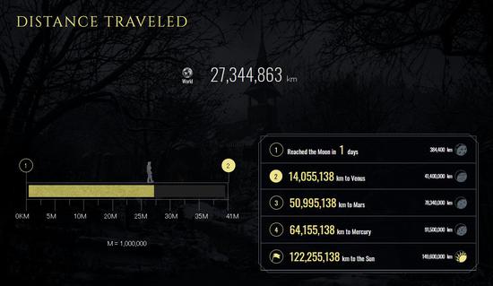 《生化危机8》官网发布了对全球玩家《生化危机8》游玩状况统计。数据显示,截止到2021年5月10日上午9点20分,全球玩家《生化8》总游玩时长为1101年161天7小时41分钟,全球玩家游玩次数89万8601次,通关次数为28万8368次,理论通关比率为32%。不过由于该数据仅统计了在游戏中连接了卡普空RENET的玩家,所以实际上游玩人数和通关人数会更多。