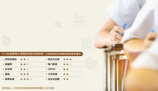 报告根据RCSP范式设置K12在线教育公司转型的若干指标,以星级形式对目前头部公司的转型竞争力进行了评估。