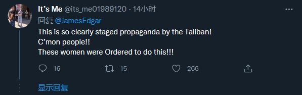 针对这张照片,推特网民进行了不同角度的解读。有人认为,这场游行是塔利班的“政治宣传”,“命令”阿富汗女性这么做。