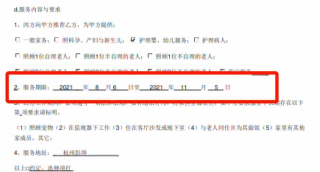 每个月的工资是8500块钱,三个月算下来是25500块钱。家政公司还跟杨女士签署了电子合同。合同上注明服务期为今年的8月6日到11月5日,为期三个月。