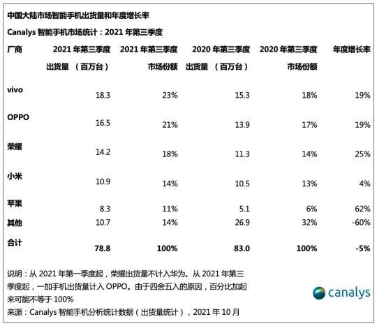 根据多家调研机构发布的2021年第三季度国内智能手机市场分析报告显示,华为在芯片端受制后,国内手机市场的格局被“完全重塑”,vivo、OPPO以及荣耀分列国内市场前三,苹果则排名第五。