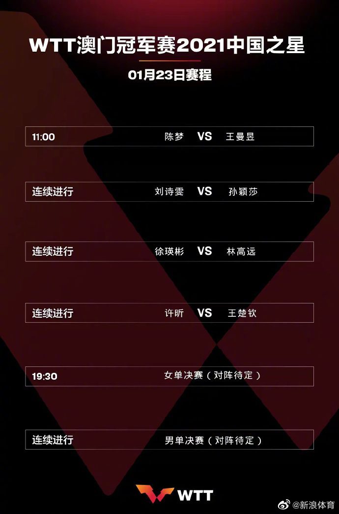 #2022WTT澳门冠军赛# 1月23日赛程:11:00@陈梦-乒乓球 vs@王曼昱随后 @刘诗雯Sunny vs@孙颖莎随后 @Eric-林高远 vs@徐瑛彬bin随后 @许昕 vs@王楚钦___19:30女单决赛随后 男单决赛