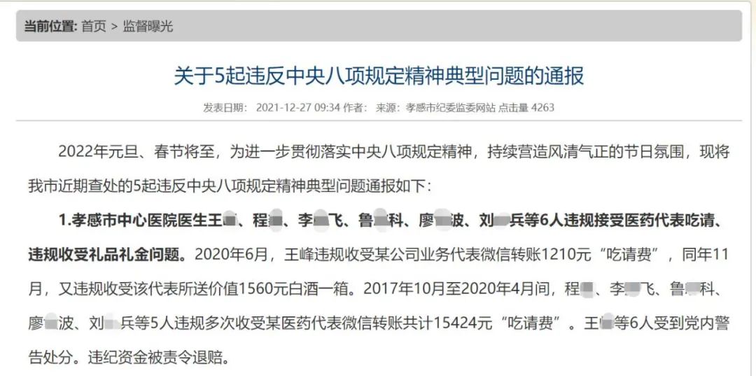 2021年12月,据湖北省孝感市纪委监委网站披露,因违规接受医药代表吃请、收受礼品礼金,孝感市中心医院6名医生受到党内警告处分,并被责令退赔违纪资金。