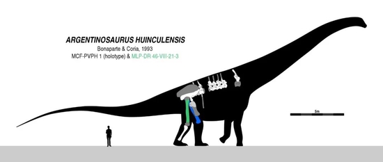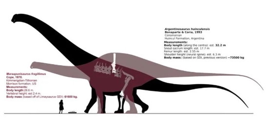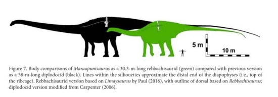许多小伙伴一定会问,最大的恐龙难道不应该是易碎双腔龙(Amphicoelias fraillimus)吗?易碎双腔龙被估计有长度超过60米、重量120吨的超大体型,曾经是神话版存在的超级巨龙!关于易碎双腔龙到底存不存在,是不是真的有那么巨大的争论持续了一个多世纪,但是古生物肯尼斯·卡彭特(Kenneth Carpenter)在2018年提出了一个惊人的理论,那就是易碎双腔龙的化石其实属于雷巴齐斯龙类,并且将其重新命名为极巨龙(Maraapunisaurus)[5]。