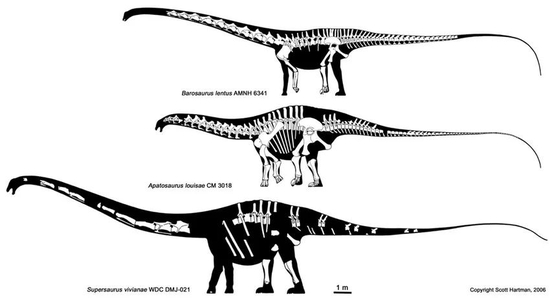 原来迈克尔·泰勒注意到一块被认定是超龙(Supersaurus)的一块脊椎骨(编号:BYU 9024)很可能属于重龙,而按照这块颈椎骨的尺寸推算,这条重龙的体长可达48米,体重在66吨左右[2]。当然啦,关于这个推算并未得到古生物界的一致认同,所以体长48米的重龙只是一个理论。