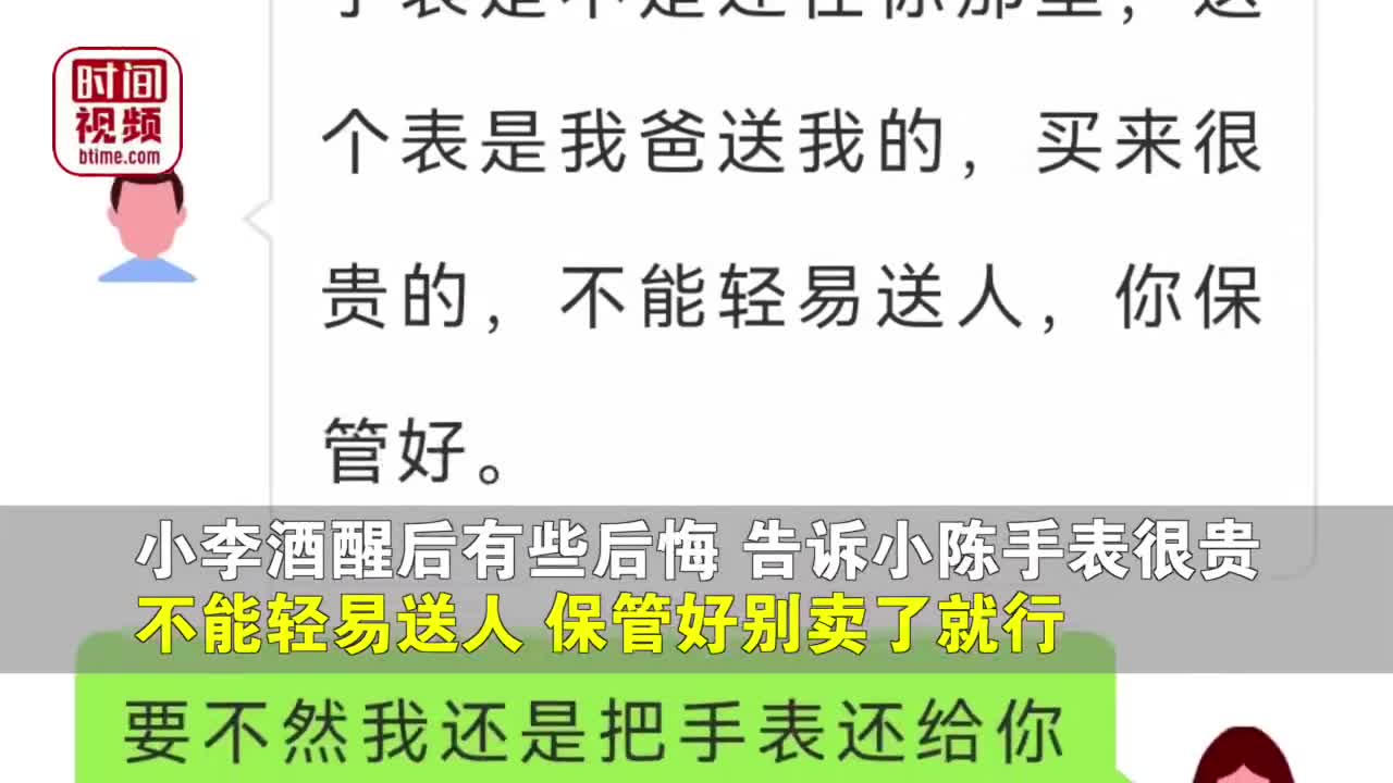 第二天酒醒后,冷静下来的小李想到自己冲动之下把价值不菲的手表随手送了出去,不禁有些后悔,便在微信上询问小陈:
