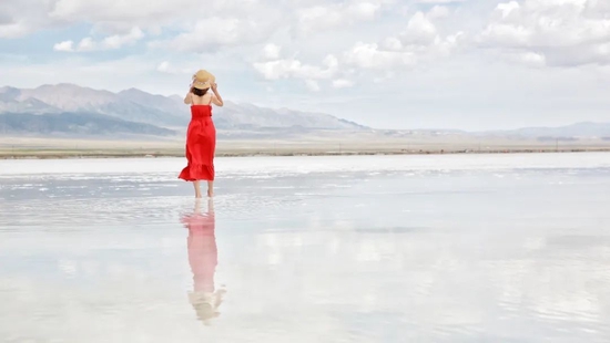 可以在盐湖里踩水游玩,穿着鲜艳的衣服打卡拍照,再和被称为奢侈的大地艺术之茶卡盐雕一起合影。