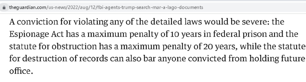 根据英国《卫报》的报道,从美国司法部公布的FBI对特朗普在美国佛罗里达州的海湖庄园别墅进行搜查的搜查令来看,被特朗普在卸任总统时从白宫带走的文件,并不是什么普通的文件,而是可能会令他危害美国国家安全、涉嫌违反美国《反间谍法》,以及涉嫌“妨害司法公正”的重要机密文件等敏感材料。FBI也正在就特朗普是否涉嫌犯下这些重罪而在进行调查。