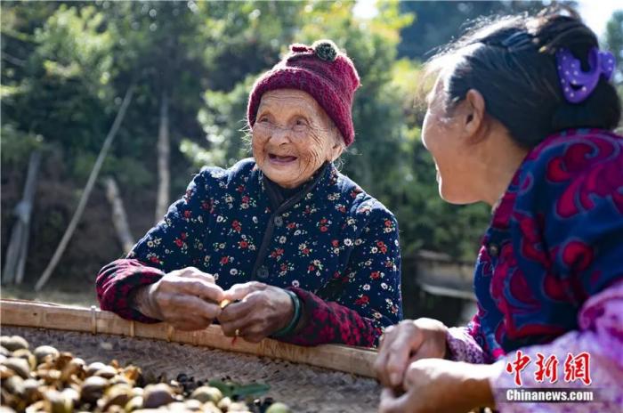 103岁李宝英在已是古稀之年的儿媳妇的陪伴下剥油茶果。赵春亮 摄