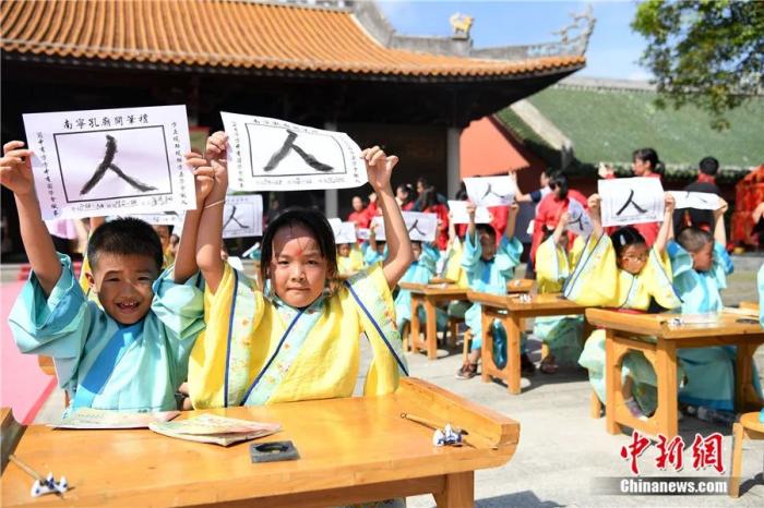 广西南宁学童展示书写的“人”字。俞靖 摄