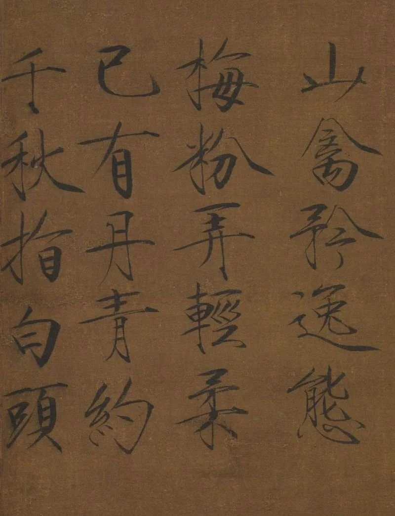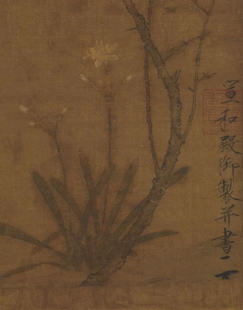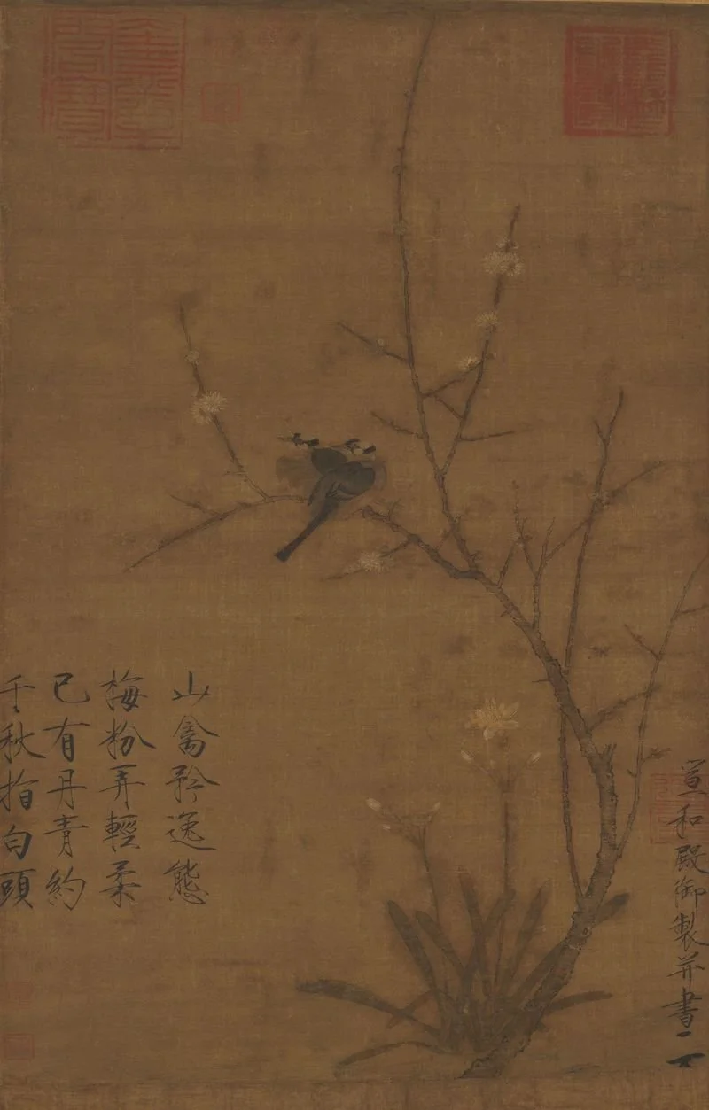 此幅可能即《宋中兴馆阁储藏图画记》中徽宗八扇屏之一的《香梅山白头》,兼具诗情画意,精练笔墨表现景物特性,构图简洁,设计S型弧线,在写生之外,又着意营造具造型美感和冬日清疏气氛的理想境界。