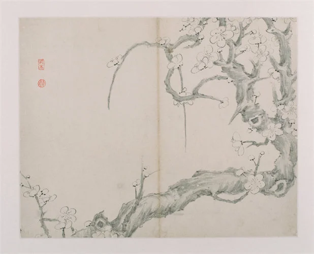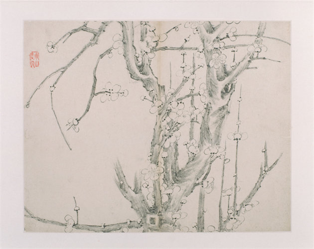 图绘一株生机盎然的梅树上,盛开的梅花洁白无瑕,交错的枝干扶摇向上,表现了梅作为花中君子“不恋世间佳丽地,独上寒山称骄子”的高逸之气。此图梅花以淡墨勾勒轮廓,线条工细,梅干以浓墨一挥而就,墨气淋漓。干与花巧妙地形成黑与白的对比,令简约的画面不失层次的变化。