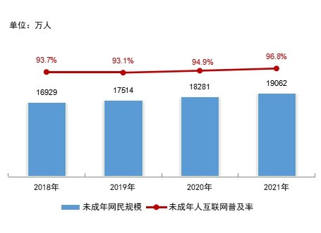 2018—2021年全国未成年网民规模与互联网普及率。图/报告截图 |