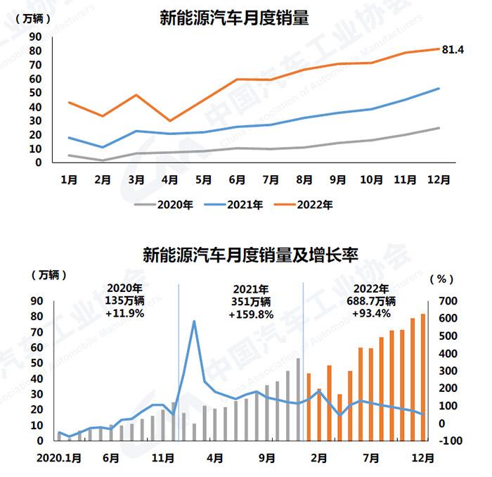 中汽协数据显示,2022年,新能源汽车持续爆发式增长,再度打破之前产销纪录。当年产销分别完成705.8万辆和688.7万辆,同比分别增长96.9%和93.4%,市场占有率达到25.6%,高于上年12.1个百分点。