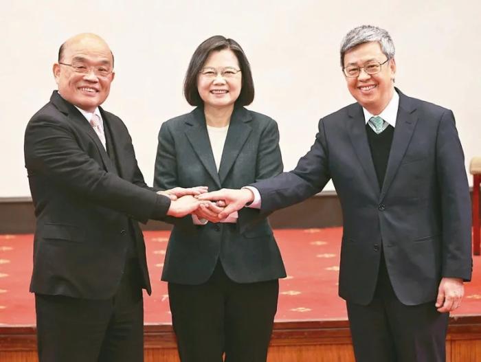 蔡英文(中)与苏贞昌(左)及陈建仁合影。图片来源:台湾联合新闻网 潘俊宏 摄