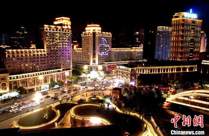 福州高楼上灯光映射的“福”和“兔”。 王东明 摄