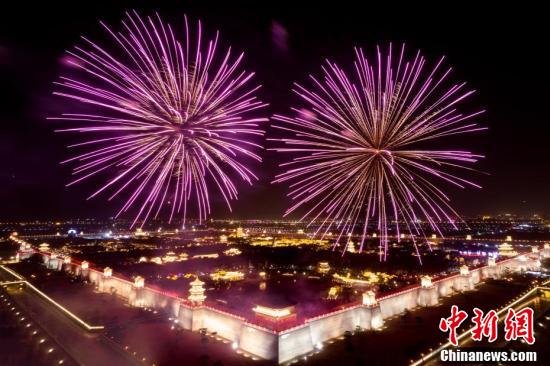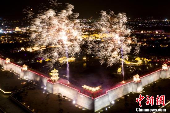 太原古县城是坐落在晋阳古城遗址上的一座明代县城,传承了晋阳古城2500多年的历史文脉。太原古县城始建于明洪武八年(1375年),隶属明清太原府,迄今已有600多年历史。太原古县城现存38处历史文化遗存,经十年保护性修复,于2021年5月开城迎客。图为无人机航拍太原古县城绽放的烟花。 韦亮 摄