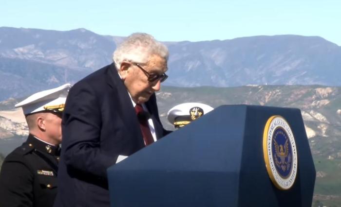 美国前国务卿基辛格在纪念美国前总统罗纳德•里根诞辰112周年的活动上发表讲话。图片来源:视频截图