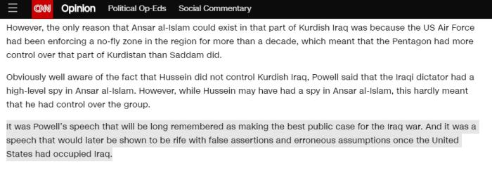 美国有线电视新闻网评论文章称,美国侵占伊拉克后,鲍威尔的演讲被发现充斥着虚假和错误的断言。图片来源:CNN报道截图
