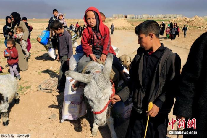 资料图:为躲避战乱,伊拉克民众离开家乡,儿童骑在驴背上。
