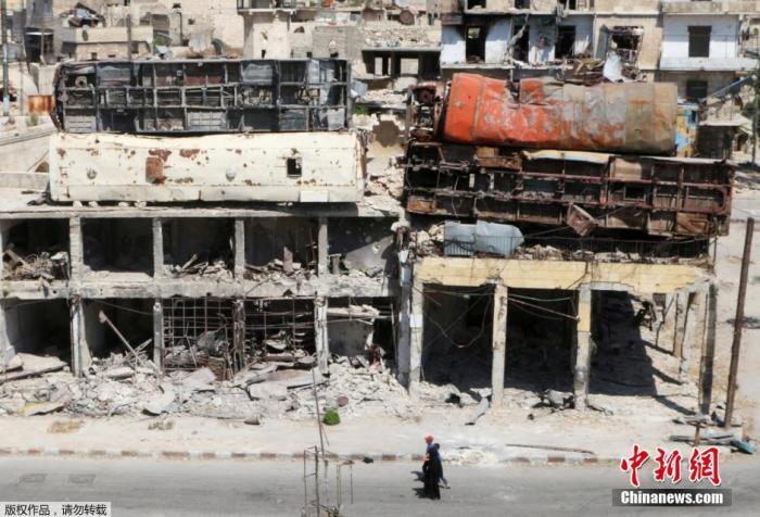资料图:空袭过后的叙利亚阿勒颇居民区。