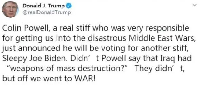 美国前总统特朗普在社交媒体上,就“伊拉克大规模杀伤性武器”一事嘲讽鲍威尔。图片来源:特朗普社交账号截图