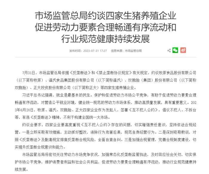 消息中提到,6月20日,牧原、温氏、双胞胎、正大四家企业作为发起人,签署《互不挖人公约》,倡议不挖人、不拆台等,有违《反垄断法》精神,不利于构建全国统一大市场。