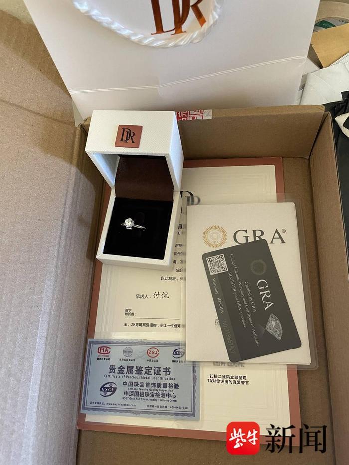 在某电商平台输入“DR钻戒”,显示出的商品很白菜价。0.5克拉、1克拉、2克拉的“钻戒”售价分别为29.8元、39.8元、49.8元。价格虽然低配,但仪式感可是一点都没减——不仅可以定制配套的“真爱协议”,还能提供“珠宝鉴定证书”和“DR包装盒”。
