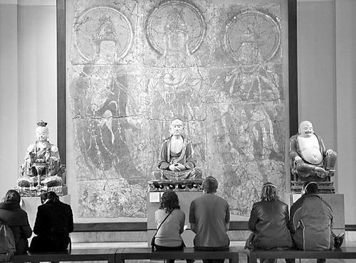 在中国厅中央墙上有几十平方米的敦煌壁画,其割痕虽犹可见,却难掩其久远的鲜丽及三位“浓丽丰肥”菩萨的雍容华贵。