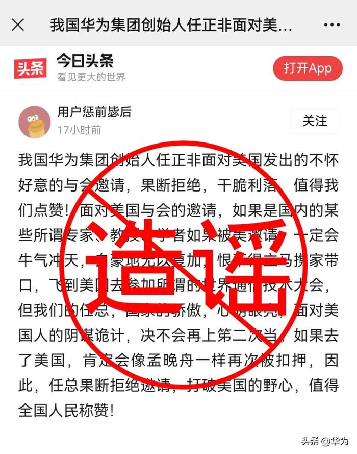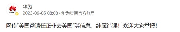 9月5日,华为发布消息:网传“美国邀请任正非去美国”等信息,纯属造谣!欢迎大家举报!