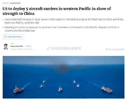 “这些部署标志着近代历史上首次有5艘美国航母同时在西太平洋执行任务,展示了美国的实力。”