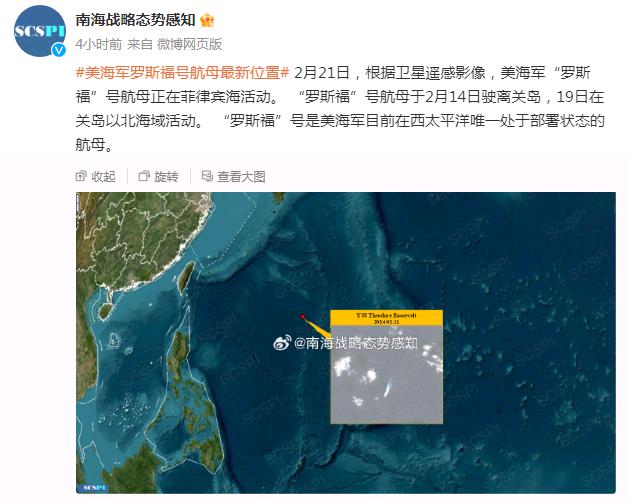 根据卫星遥感影像,“罗斯福”号航母21日正在菲律宾海活动。“罗斯福”号航母于2月14日驶离关岛,19日在关岛以北海域活动。此前“罗斯福”号于1月进入西太平洋开始此轮海外部署,预计还可以在西太平洋地区巡逻数月,因此它也是美海军目前在西太平洋唯一处于部署状态的航母。