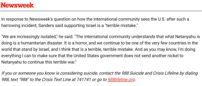 另一家媒体《新闻周刊》,现在则会在每一篇有关布什内尔的文章文末附上预防自杀热线的信息。比如下面这篇文章只是关于美国左翼议员伯尼·桑德斯对布什内尔事件的评论,内容跟布什内尔本人其实无甚关系,也要附上这么一段……