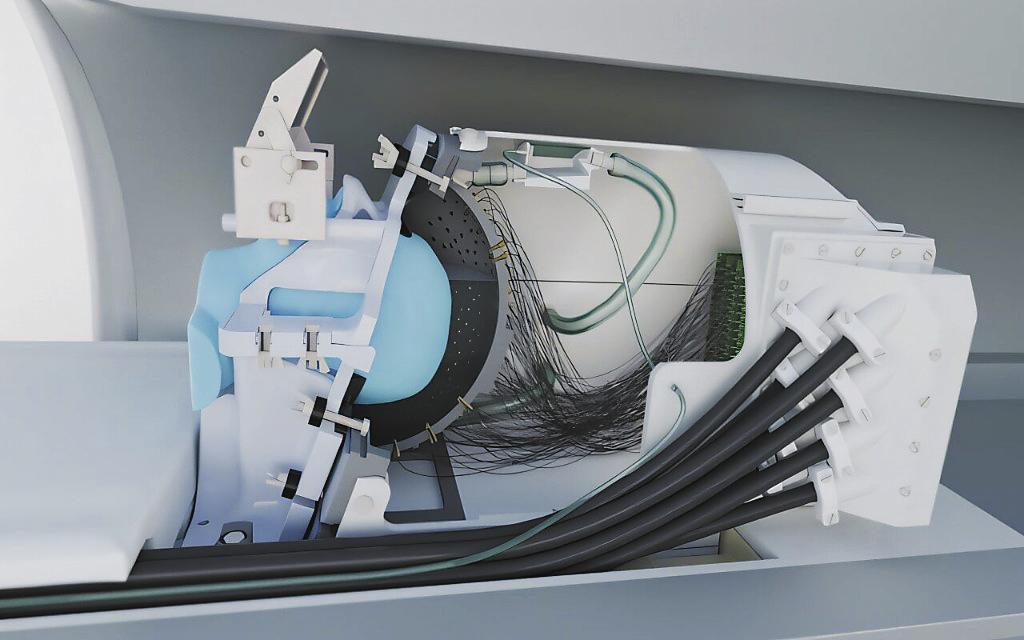 这款特殊头盔内置256个超声元件,可向大脑特定区域发射聚焦超声波,以调控神经元活动。它还配备一个柔性塑料面罩,能够稳定头部位置,进一步提升瞄准精度。