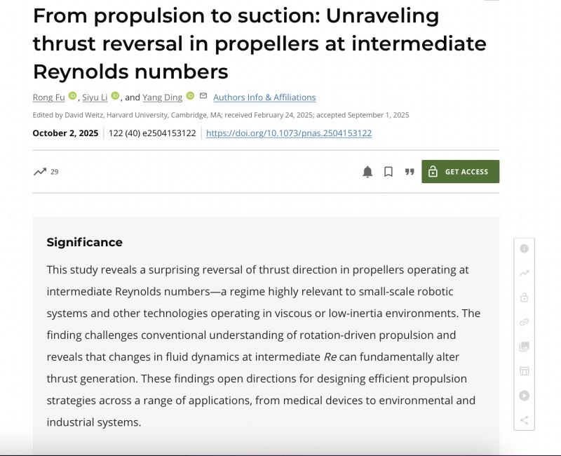 近日,北京邮电大学丁阳教授及团队在《美国国家科学院院刊》(PNAS)发表重磅成果,首次发现螺旋桨推进系统的“推进力反转”现象——特定场景下,无论螺旋桨正转、反转,物体均会后退。该发现突破传统推进流体动力学认知,为螺旋桨推进在医疗、环保等微型机器人实际应用中即将面临的困境提出预警及可能的解决方案,相关论文已于北京时间10月3日上线。