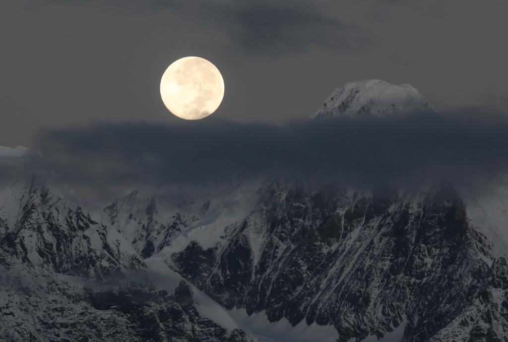 2024年10月17日,在云南迪庆藏族自治州梅里雪山拍摄的年度最大满月。(白继开 摄)
