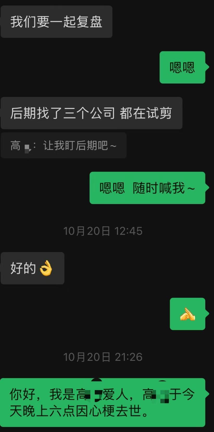 高先生离世后,医院诊断死亡原因为心梗。为了不影响丈夫的后续工作,王女士用高先生的手机在朋友圈发了讣告。