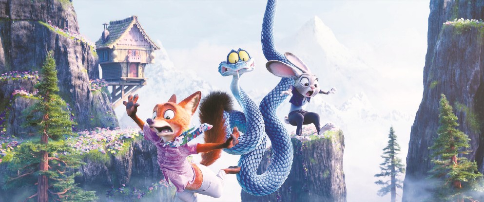 不过《疯狂动物城2》的“奔跑”意涵并不会上升到《罗拉快跑》的哲思层面。动物们的一路狂奔自然也是为了成就影片的“好看”。从冰山雪川到热带雨林,从沙漠风生到沼泽水起,汽车追逐要的是光怪陆离的街景,水里逃生要的是窒息压迫的氛围,冰雪对决要的是苍茫一片的天地。观众们的视线跟随着动物角色的行动高速地移转,从一个惊奇进入下一个惊奇,从一处景观转入下一个景观,这种步移景换的观看,与他们在迪士尼游乐园里进行沉浸式大型项目的体验非常相似。只不过,目迷五色的“眩晕”体验从5分钟延长到了100分钟。未来的一个市场可能大概是,人们会有机会在某处的迪士尼乐园项目中重温熟悉而亲切的疯狂动物城记忆。