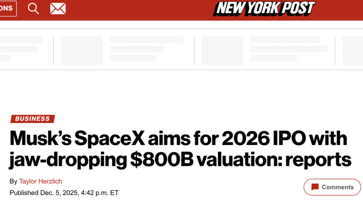 外媒称,此次估值较上一轮二次股票出售时的4000亿美元实现翻倍。SpaceX采用“要约收购”(Tender Offer)模式,通常每年进行两次,允许员工和早期投资者出售股份套现,同时也为新投资者提供入场机会。尽管8000亿美元的估值目标雄心勃勃,但鉴于SpaceX拥有一批长期支持其高估值的投资者群体,市场对此普遍持乐观态度。
