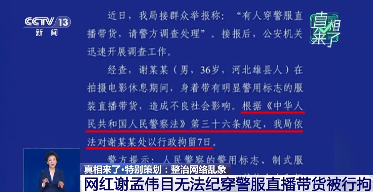 在流量与利益的诱惑交织下,部分网红迷失了方向,甚至不惜踩踏法律红线。“网红”谢孟伟曾是童星出道,今年9月,他身着人民警察制式服装在直播间卖货,不仅目无法纪,还口出狂言,在网友举报后,被云南警方行政拘留7天。