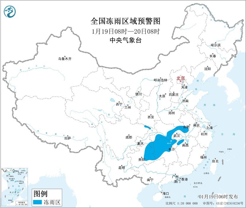 中央气象台1月19日06时继续发布冰冻黄色预警: