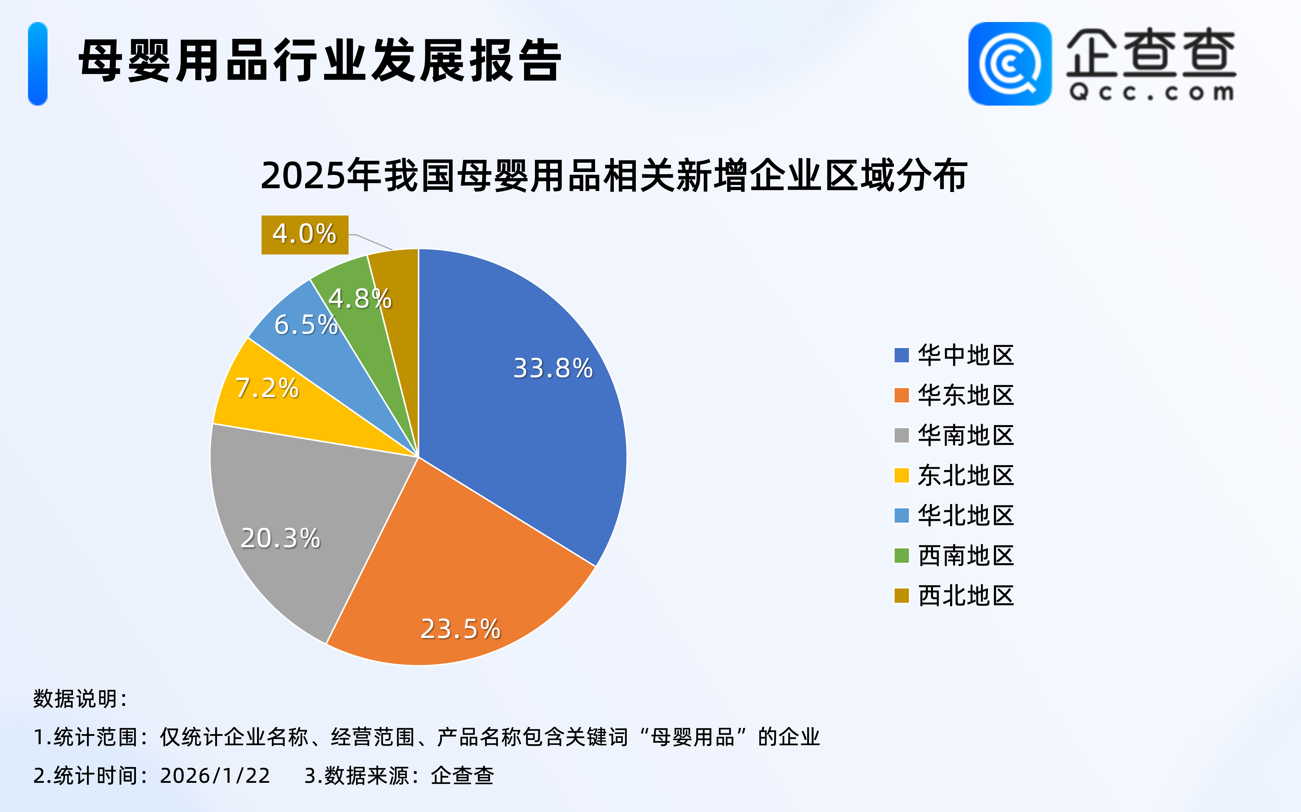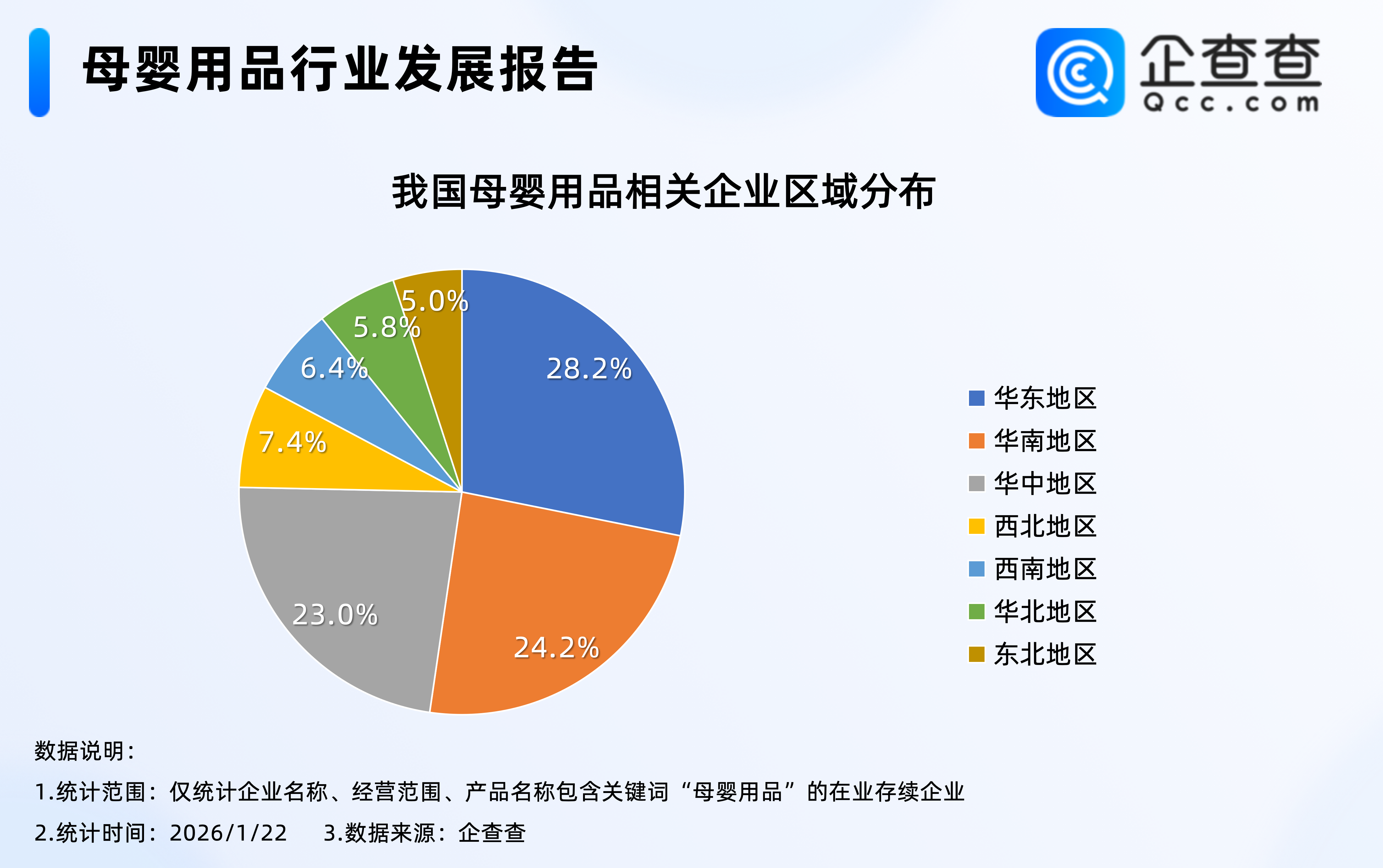 企查查数据显示,截至1月22日,我国现存1129万家母婴用品相关企业,区域分布上,华东地区最多,占比28.2%,其次是华南、华中地区;与全国存量区域分布不同的是,2025年注册的母婴用品相关企业中,华中地区凭借116.6万家的注册量,成为全国母婴用品相关企业注册量最大的区域。