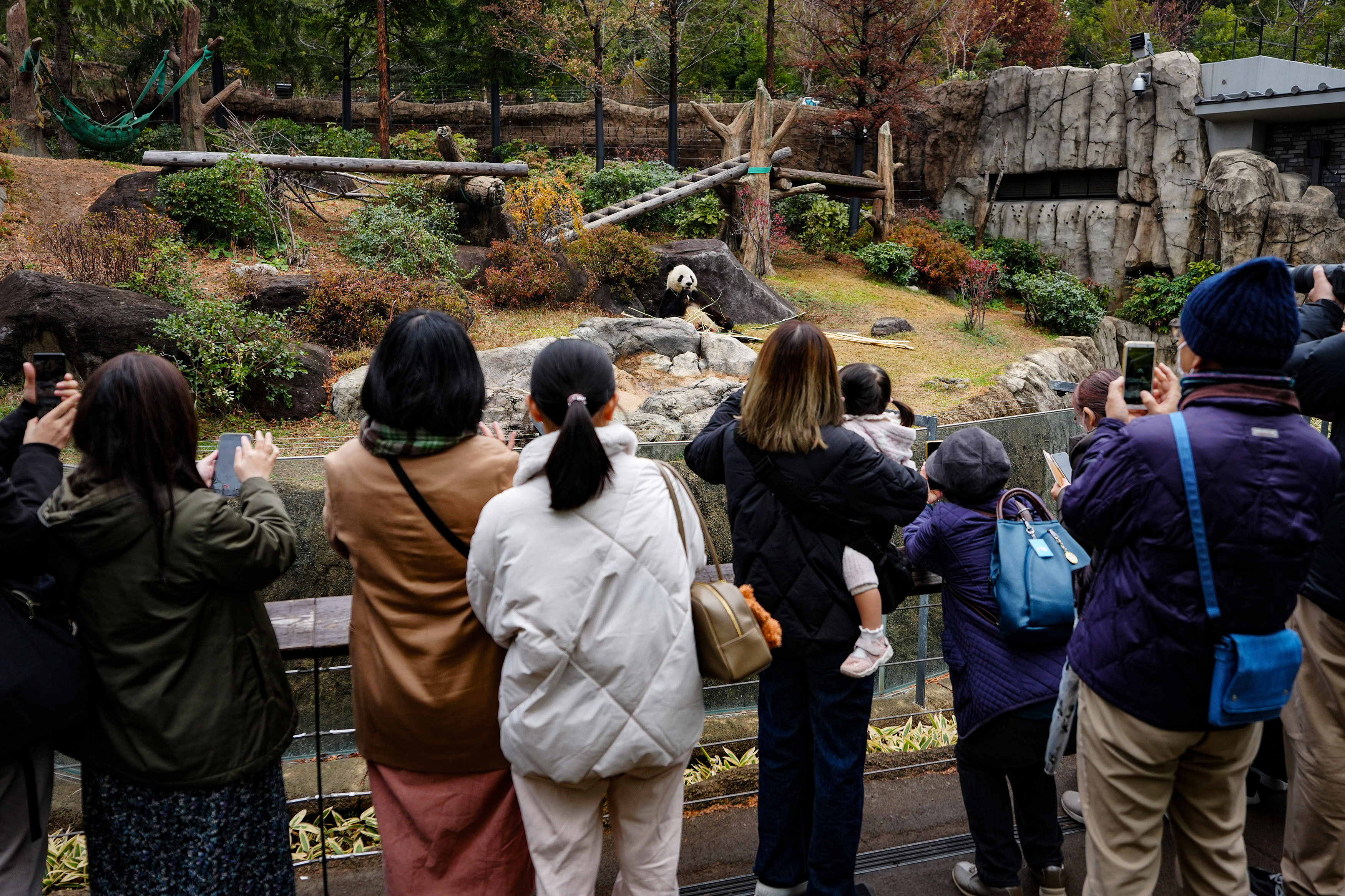尽管上野动物园设置了每人一分钟的参观限制,但即将归国的这对大熊猫双胞胎依旧吸引了大批游客前来。许多游客手持大熊猫主题玩偶,看着大熊猫啃食竹子、踱步闲逛,一边呼唤着它们的名字,一边用手机记录下这些瞬间。