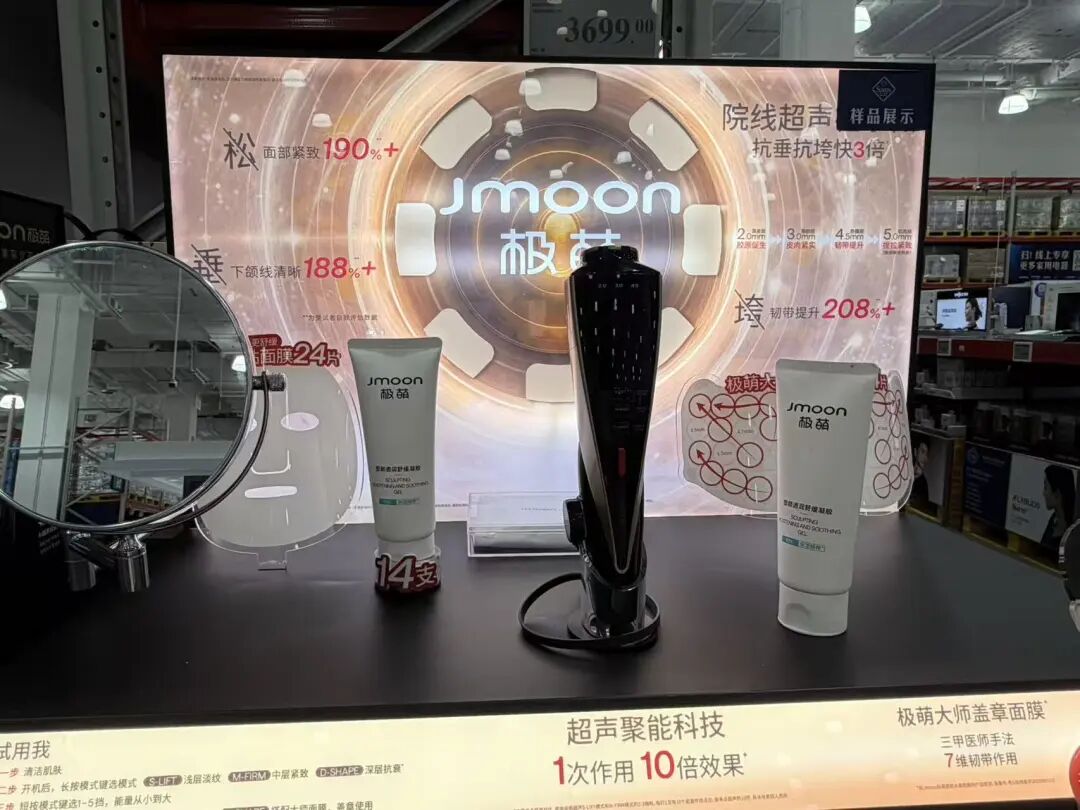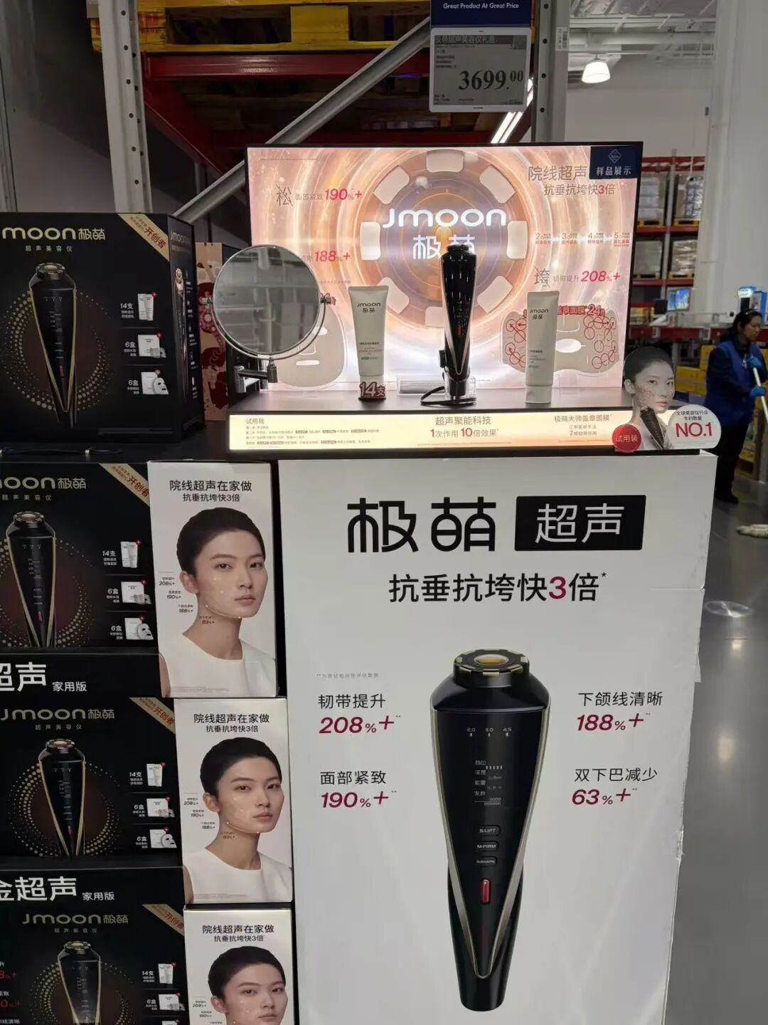 315前夕,在某山姆会员商店里,打着“院线超声在家做”旗号的极萌超声炮美容仪被摆放在货架显眼位置,货架上方的电子宣传屏显示着“面部紧致190%+”、“下颌线清晰188%+”、“韧带提升208%+”的醒目标语,吸引了不少会员驻足。