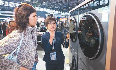 海尔工作人员向观众介绍洗衣机“智慧洗”功能。 海外网 谢 明摄