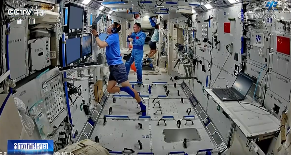 空间站内环境监测与设备检查维护同步进行。三名航天员使用相关仪器设备完成舱内空气洁净度测试、声环境监测。对饮水分配器、再生生保系统设备进行检查维护,并定期整理舱内物资、转移存放废弃物,保持站内的环境整洁。