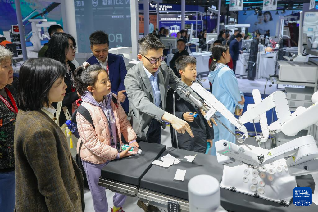 3月29日,在2026中国医学装备展览会现场,工作人员为观众讲解分体式手术机器人工作原理。 2026医学装备大会暨医学装备展览会3月26日至29日在重庆国际博览中心举行,超800家企业参展,众多医学装备创新成果与前沿技术集中亮相。 新华社记者 黄伟 摄